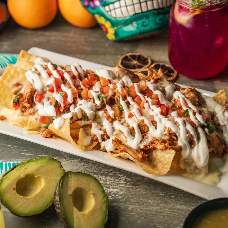 Shredded pork cooked in our homemade BBQ sauce topped with mixed cheese, white cheese dip, pico de gallo, and sour cream.
